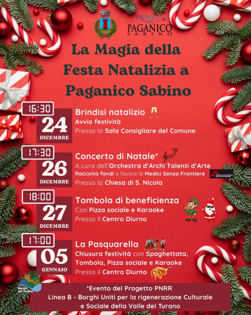 - a Paganico Sabino dal 24 dicembre al 5 gennaio con La Magia della Festa Natalizia a Paganico Sabino;