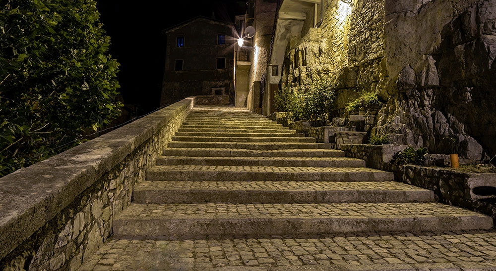 Varcate le mura, affascina il caratteristico tessuto urbano fatto di tortuosi vicoli che si arrampicano a chiocciola, accompagnati da stradine trasversali e raccordati da strette gradinate che conducono fino all’apice. Qui ci aspettano la Chiesa Collegiata di S. Erasmo, il tempio trecentesco che conserva diversi importanti affreschi e un prezioso tabernacolo in marmo del XVI secolo, e la Chiesa di San Nicola del XIII secolo.