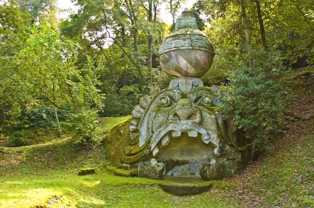 Fantastic and grotesque sculptures are scattered without apparent logic in a wooded area; the work of the architect Pirro Ligorio, author of the Villa d’Este fountains in Tivoli, and of Vicino Orsini in the middle of the XVI century.