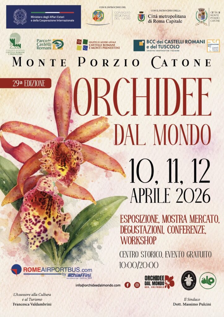 Torna nel centro storico di Monte Porzio Catone dal 10 al 12 aprile 2026, Orchidee dal Mondo, la 29^ mostra mercato internazionale dedicata a esemplari pregiati e rari di orchidee provenienti da tutto il mondo.