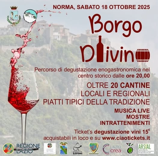 Norma torna protagonista il 18 ottobre con Borgo di Vino, la quarta edizione della manifestazione che celebra le eccellenze enogastronomiche del territorio. A partire dalle 19.00 il suggestivo centro storico si trasformerà in un percorso di sapori e profumi, con oltre venti cantine e trenta etichette locali e regionali pronte a raccontare la passione e la qualità dei produttori.