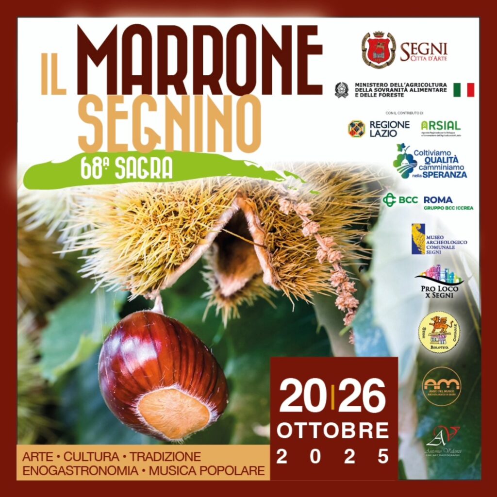 Dal 20 al 26 ottobre 2025 torna a Segni la 68ª Sagra del Marrone Segnino, per ritrovare i sapori autentici della tradizione.