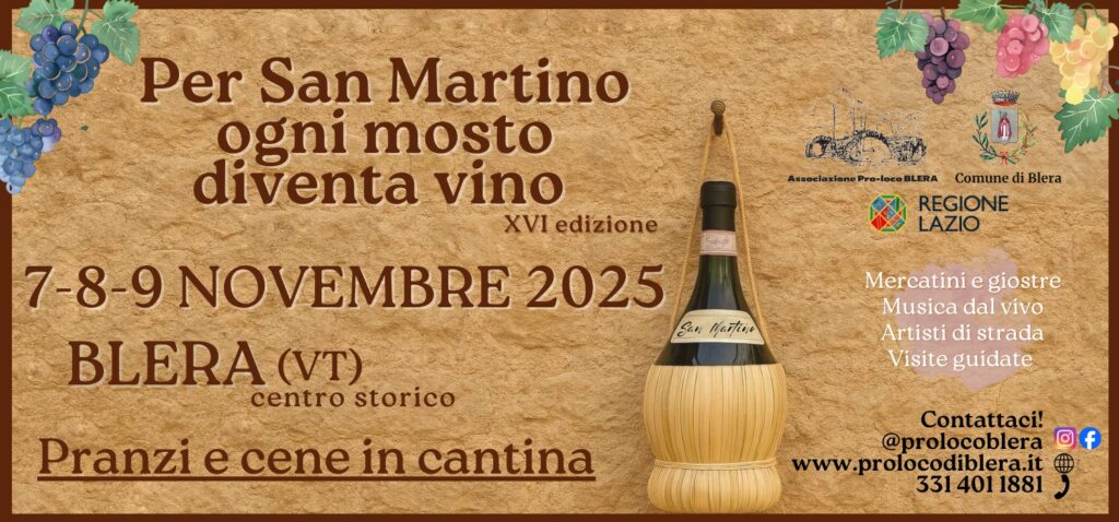 A Blera nei giorni dal 7 al 9 novembre, si rinnova l’evento enogastronomico “Ogni mosto diventa vino”, dedicato alla celebrazione del vino novello locale.