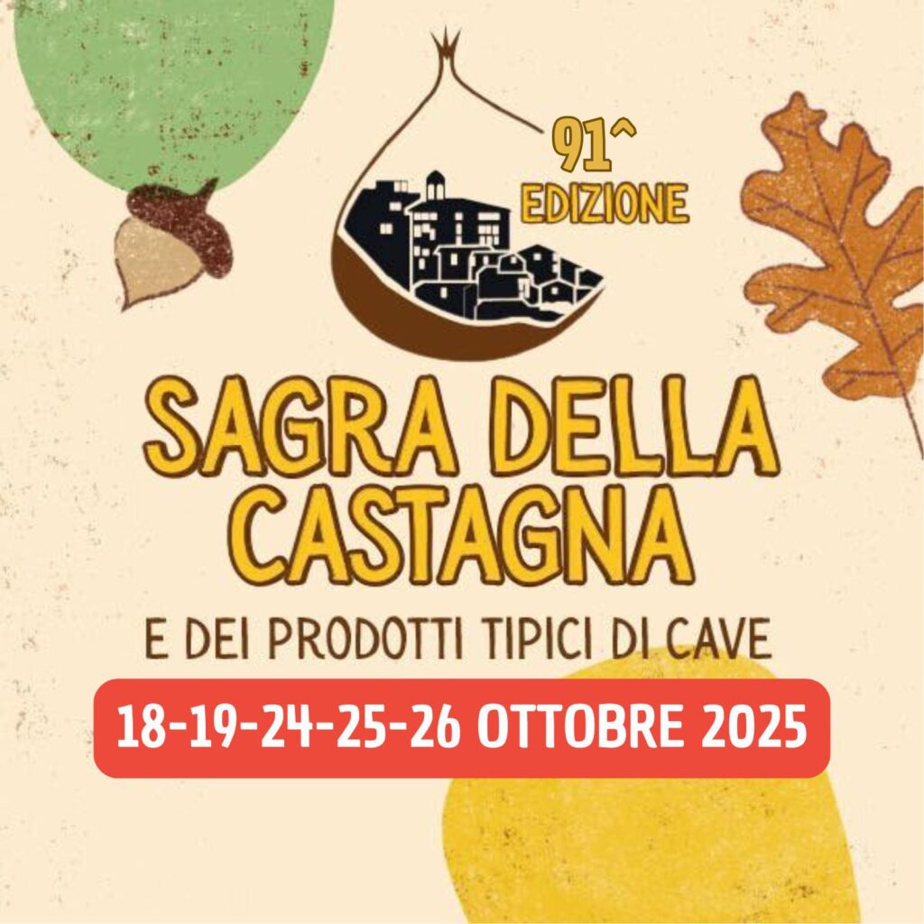 Al via dal 24 al 26 ottobre 2025 la 91^ Sagra della Castagna e dei prodotti tipici di Cave, una grande festa che inizia con il Pre Sagra nel weekend 18 – 19 ottobre per proseguire lungo le strade dell’antico borgo di Cave nel weekend successivo.