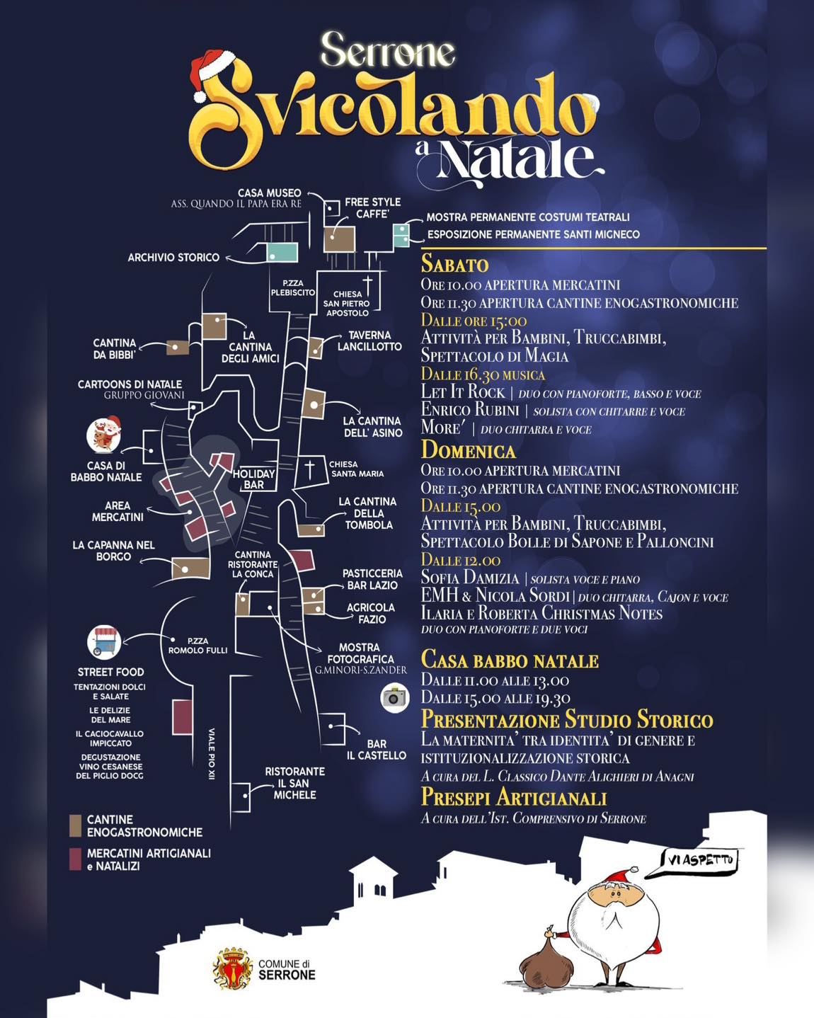 Svicolando a Natale mette in programma a Serrone il Presepe a grandezza naturale, un percorso di degustazione, cantine enogastronomiche, musica, mercatini e la Cantina di Babbo Natale. L’8 dicembre alle ore 10 si inizia con la benedizione del Presepe e l’apertura di mercatini e cantine enogastronomiche.
