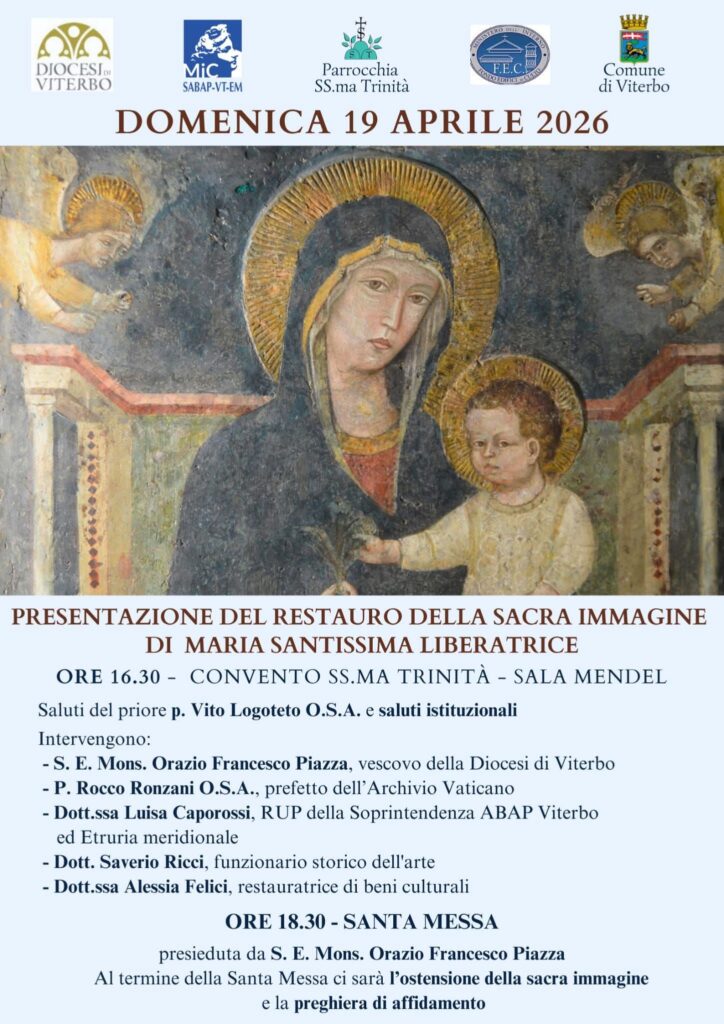 Domenica 19 aprile 2026 alle ore 16.30, presso il Convento SS.ma Trinità a Viterbo, presentazione tecnica e storica del ritorno allo splendore della sacra immagine di Maria Santissima Liberatrice.