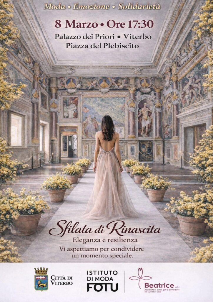 “La sfilata di Rinascita”: una iniziativa che nasce dalla collaborazione tra il Comune di Viterbo, l’Istituto di Moda FOTU e l’Associazione Beatrice con l’obiettivo di celebrare non solo l’estetica e il Made in Italy, ma soprattutto la forza della rinascita collettiva e individuale attraverso la solidarietà.