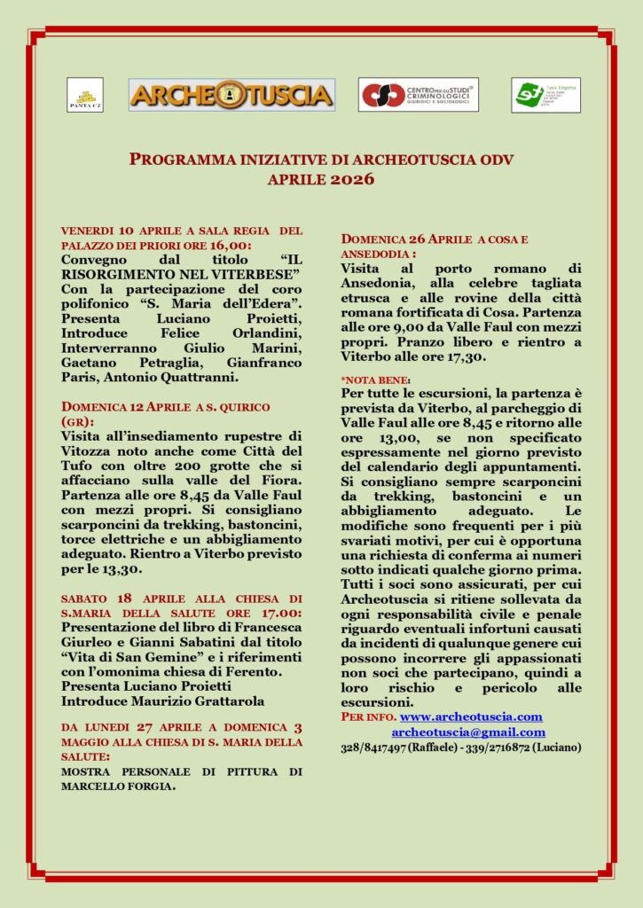 A Viterbo dal 10 aprile al 5 maggio 2026 un calendario ricco di appuntamenti per riscoprire le meraviglie del territorio con un programma di appuntamenti tra convegni storici, visite a insediamenti rupestri e città romane.