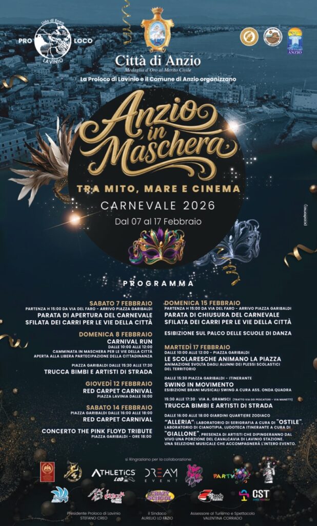Al via Anzio in Machera dal 7 al 17 febbraio 2026 con 6 giornate clou sul tema “Anzio tra mito, mare e cinema”, il 7 e l’8, il 12, il 14, il 15 e il 17 febbraio. All’evento partecipano associazioni dilettantistiche sportive, culturali del territorio, scuole di danza e artisti di strada.