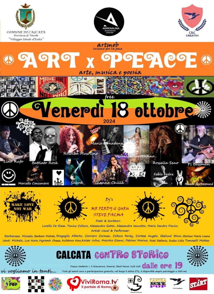 Venerdì 18 ottobre 2024 dalle ore 19.00 a notte tarda, presso il borgo medievale di Calcata, l’associazione culturale Adrenalina assieme con il Comune di Calcata, presenta l’evento “Art x Peace”.