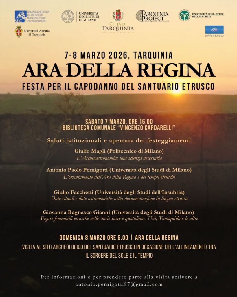 Il primo appuntamento sarà sabato alle ore 16:00, con una conferenza dedicata alle indagini archeologiche condotte presso l’Ara della Regina, alle datazioni astronomiche e al rapporto tra architettura sacra e cielo nel mondo etrusco.
