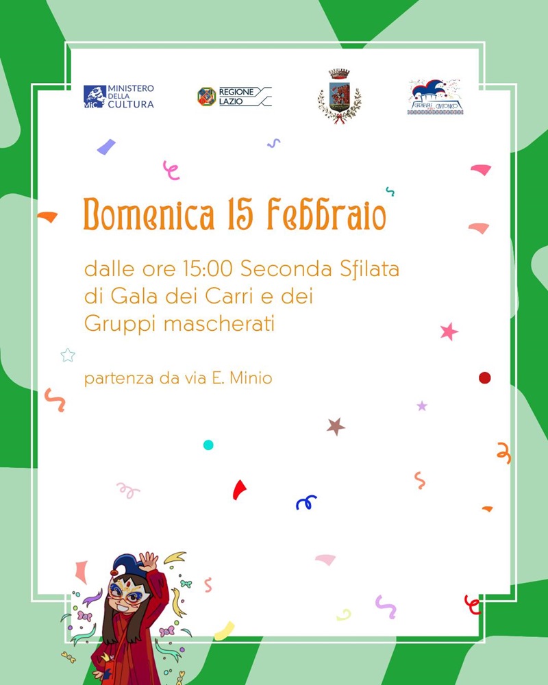 A Civita Castellana tornano i protagonisti del Carnevale storico civitonico. Domenica 15 febbraio 2026, con partenza da via Minio alle ore 15, è in programma la seconda Sfilata di Gala dei Carri allegorici e dei Gruppi mascherati.