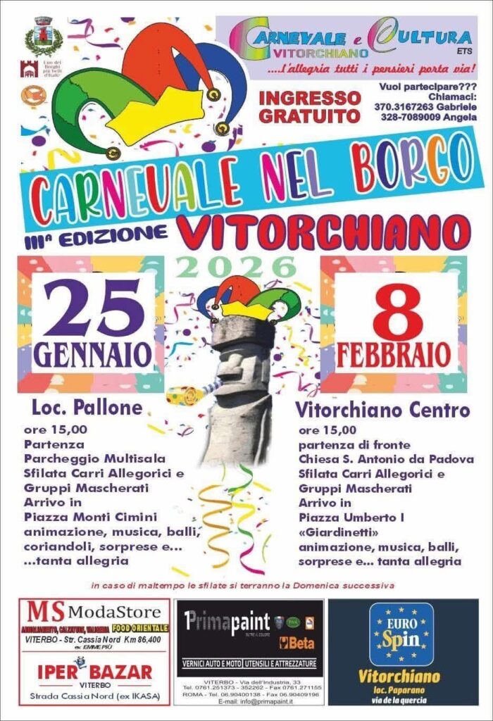 Sarà infatti la località Pallone, ad aprire il 25 gennaio 2026 alle 15.00, la terza edizione dell’evento con la sfilata dei Carri allegorici che al suo arrivo in piazza Monti Cimini coinvolgerà tutti in una grande festa, con musica, balli e animazione.