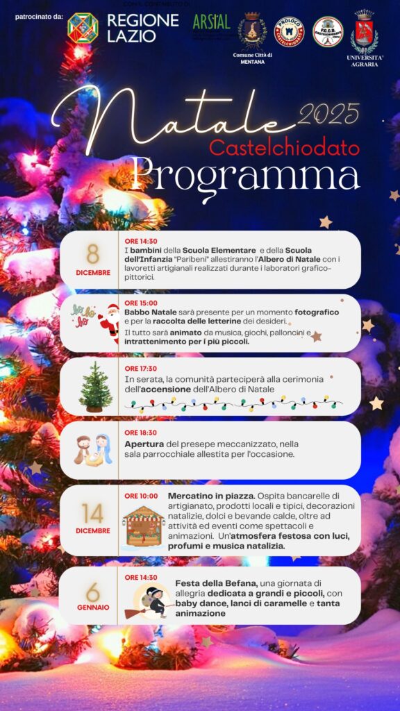 Dall’8 dicembre 2025 al 6 gennaio 2026 a Castelchiodato di Mentana si festeggia il Natale 2025, con tante attrazioni caratteristiche, momenti ludici e di convivialità.