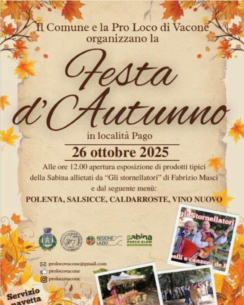 A Vacone, nell’incantevole scenario del Pago (l’antico Pagus romano), l’ultima domenica di ottobre si svolgerà la festa d’autunno. A partire dalle 12 si potrà degustare un menu delizioso con polenta, salsicce, castagne e vino novello,,accompagnato da Gli stornellatori di Fabrizio Masci.