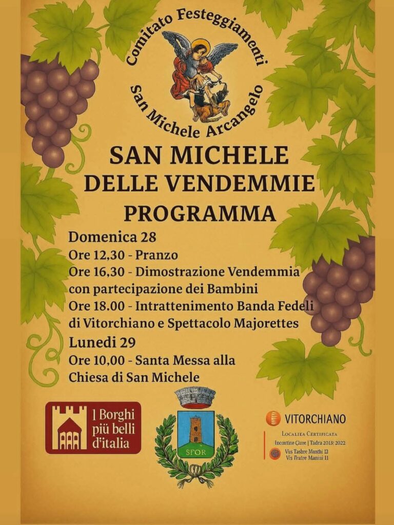 A Vitorchiano in occasione della ricorrenza di San Michele delle Vendemmie, domenica 28 e lunedì 29 settembre, il Comitato San Michele Arcangelo valorizza lo splendido borgo sospeso su uno sperone tufaceo, con festeggiamenti e un pranzo sociale, presso l’ex Convento del Complesso Sant’Agnese.