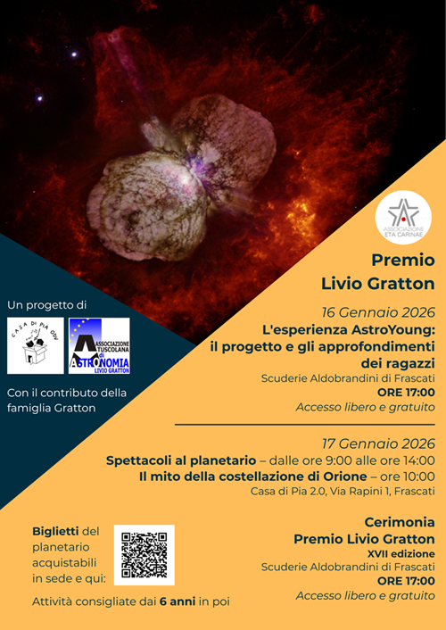 Il momento più atteso è quello presso le Scuderie Aldobrandini di Frascati sabato 17 gennaio alle ore 17:00 con la cerimonia di consegna del prestigioso Premio “Livio Gratton”, giunto alla 17ª edizione. A seguire la conferenza, a cura dell’Istituto Nazionale di Astrofisica – Osservatorio Astronomico di Padova, sul tema “Più testimoni, un solo delitto: i transienti luminosi nell’astronomia multi-messenger”. L’evento è ad accesso libero e gratuito, e sarà trasmesso anche online, sulla pagina facebook e sul canale YouTube dell’ATA.