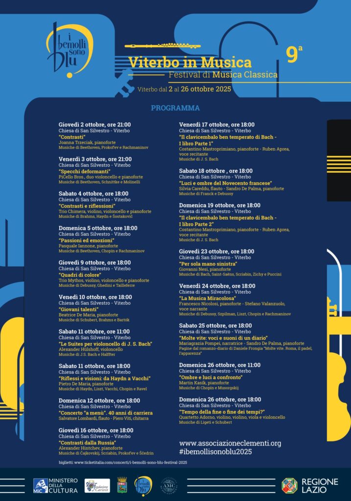 La nona edizione del Festival autunnale “I Bemolli sono Blu – Viterbo in Musica”, organizzato dall’associazione musicale Muzio Clementi e curato dal direttore artistico Sandro De Palma, approda, per il mese di ottobre, alla chiesa di San Silvestro a Viterbo, dove proporrà altri 18 nuovi spettacoli musicali, tra serali, mattutini e pomeridiani.