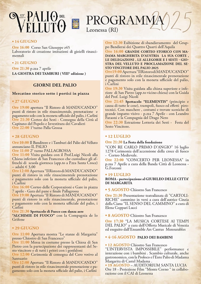 A Leonessa il 121° Palio del Velluto è un vero e proprio ritorno al Rinascimento. La rievocazione storica, i teatri equestri, i musici, i giullari e le ricette rinascimentali da gustare nelle caratteristiche taverne riportano al Cinquecento. Il tutto animato dall’accesa rivalità fra i Sesti, le sei contrade che compongono Leonessa, bandiera arancione Touring, fondata nel 1278 da Carlo d’Angiò.