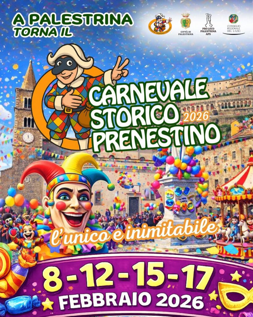 Al via il Carnevale Prenestino nel centro storico di Palestrina dall’8 al 17 febbraio 2026, cantato dal poeta Trilussa lamentando la decadenza dei grandi festeggiamenti di una volta. Sono quattro le giornate clou, a partire dalle ore 15:30: domenica 8, giovedì 12, domenica 15 e martedì 17 febbraio 2026.