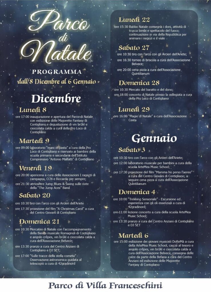 Il Parco di Natale offrirà fino al 6 gennaio una serie di manifestazioni animate dalla Banda Musicale di Contigliano e dalle Majorettes Fantasy. L’accensione dell’albero di Natale con l’inaugurazione del Villaggio di Natale sarà un momento speciale per scoprire la magia del Natale. Sarà, inoltre, possibile degustare cioccolata calda, crepes e vin brulè per scaldare i pomeriggi di festa.