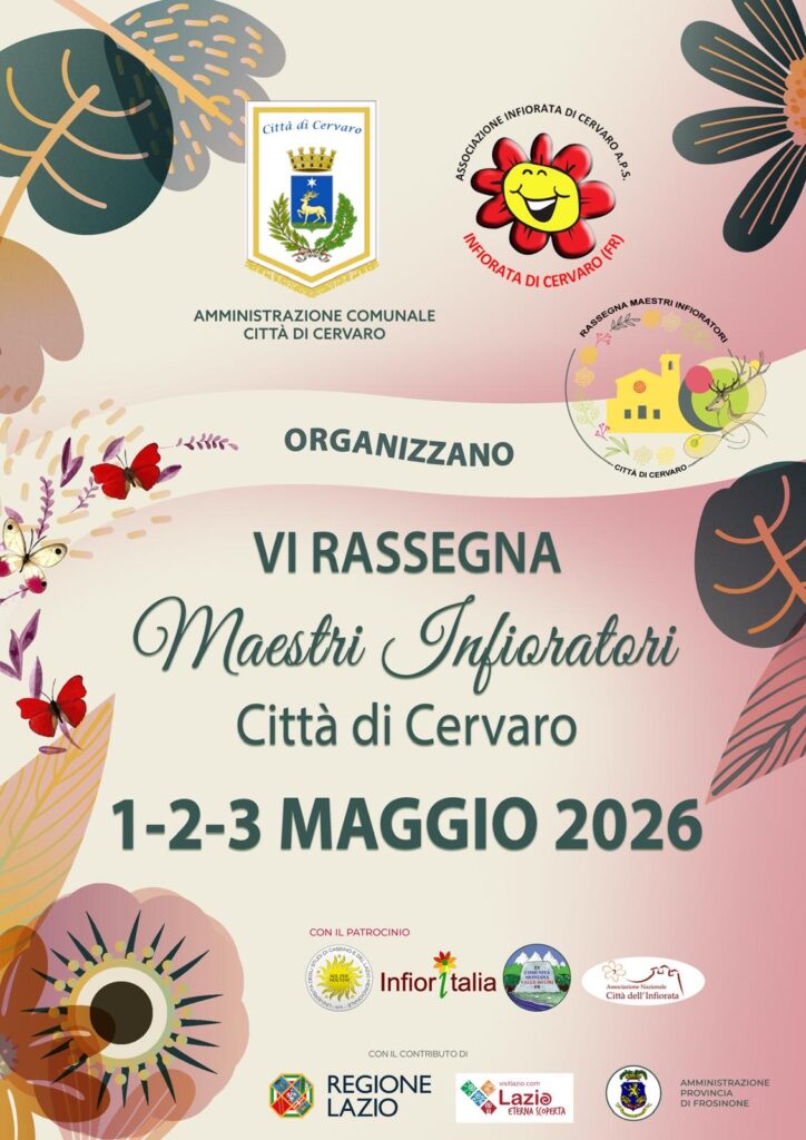 Dal 1 al 3 maggio Cervaro (Fr) ospita la VI rassegna nazionale dei maestri infioratori, a cui si uniranno vari paesi del Lazio, di altre regioni e anche un paese della Polonia per realizzare variopinti tappeti floreali.
