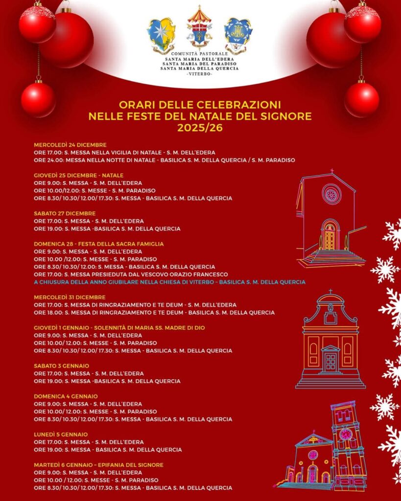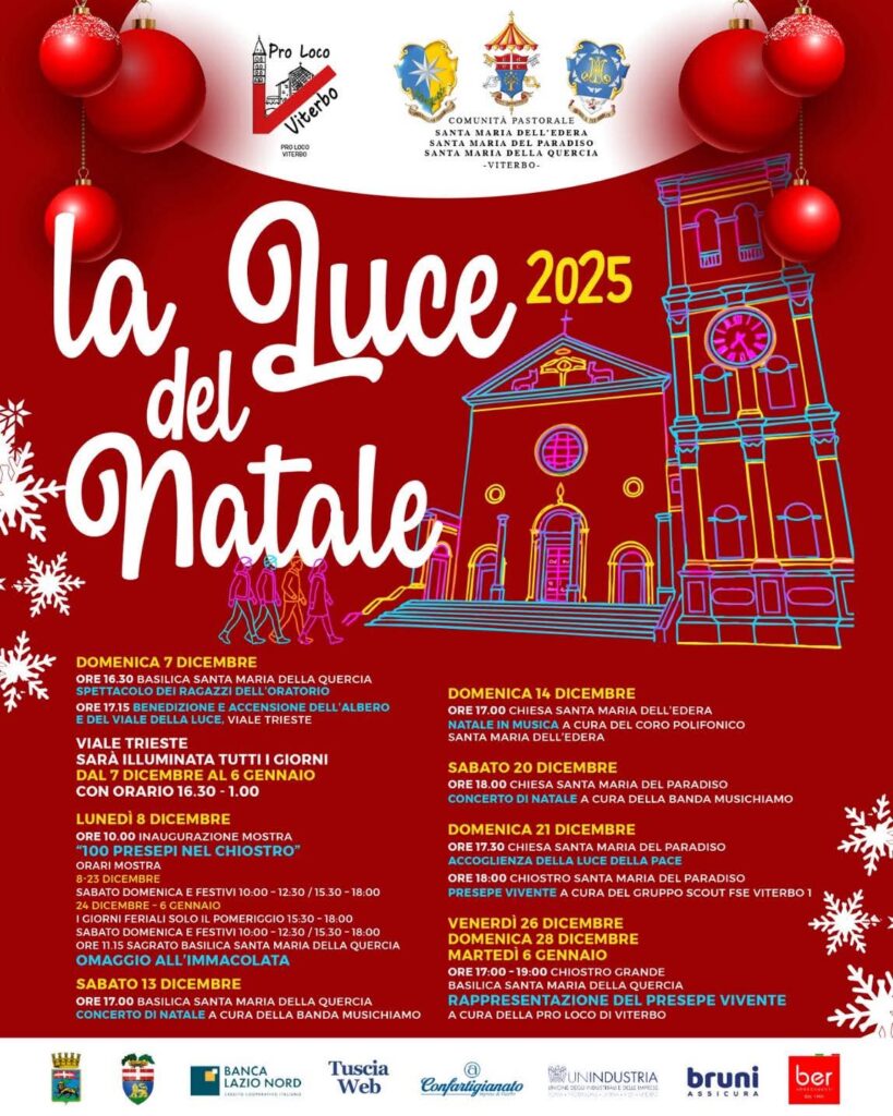 Dal 7 dicembre 2025 dalle ore 16.30 presso la Quercia –Viterbo, la Parrocchia Basilica Santuario Santa Maria della Quercia, la Pro Loco e tutte le realtà religiose cittadine daranno avvio alle celebrazioni religiose e alle attività di festeggiamenti legate al Natale 2025 che, per questo anno, oltre alla tradizionale accensione dell’albero alle ore 17,15 vede una illuminazione speciale lungo tutta via Trieste fino al Santuario.