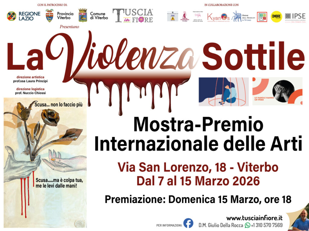 Dal 7 al 15 marzo 2026 presso la AEGallery di Viterbo si svolge La Violenza Sottile, Mostra Premio Internazionale delle Arti.