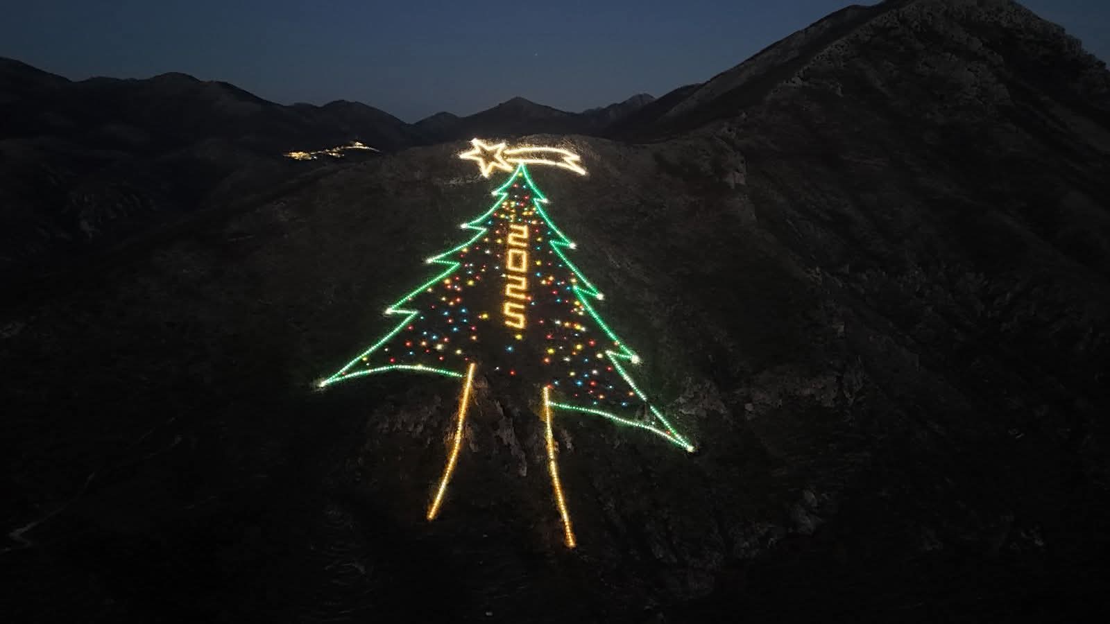 L’imponente albero è alto 470 metri ed è realizzato con 14.000 metri di cavi elettrici, 900 lampadine colorate, ha una superficie di circa otto campi da calcio e rimarrà acceso fino al 6 gennaio 2026.