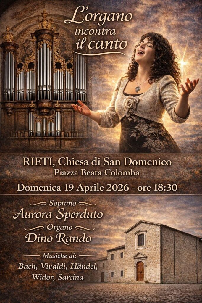 Domenica 19 aprile alle ore 18,30 la Chiesa di San Domenico a Rieti ospiterà l’evento “L’Organo incontra il Canto”. La manifestazione rappresenta un suggestivo incontro tra musica e spiritualità con il concerto per organo e voce. Vedrà protagonisti il soprano Aurora Sperduto e l’organista Dino Rando, pronti a far risuonare le navate dello storico edificio con le note del monumentale organo Dom Bedos-Roubo.