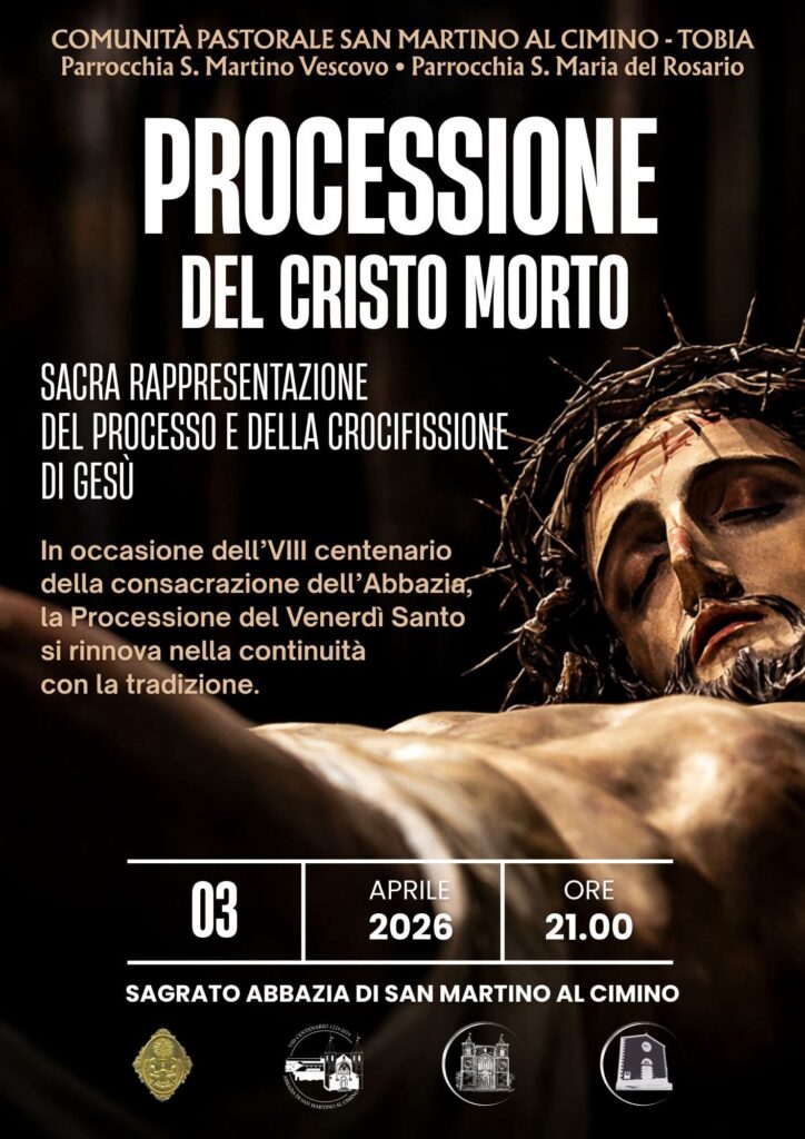 In occasione dell’VII centenario della Consacrazione dell’Abbazia, la Comunità pastorale di San Martino al Cimino e Tobia invita tutta la cittadinanza e visitatori della Tuscia Viterbese alla Processione del Cristo Morto, che avrà luogo venerdì 3 aprile 2026 sul Sagrato dell’Abbazia di San Martino al Cimino ad iniziare dalle ore 21.00.