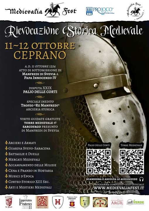 Domenica 12 ottobre in chiusura sono previsti il “Palio Delle Corti” e la drammatizzazione teatrale “La sottomissione di Manfredi di Svevia a Papa Innocenzo IV”.
