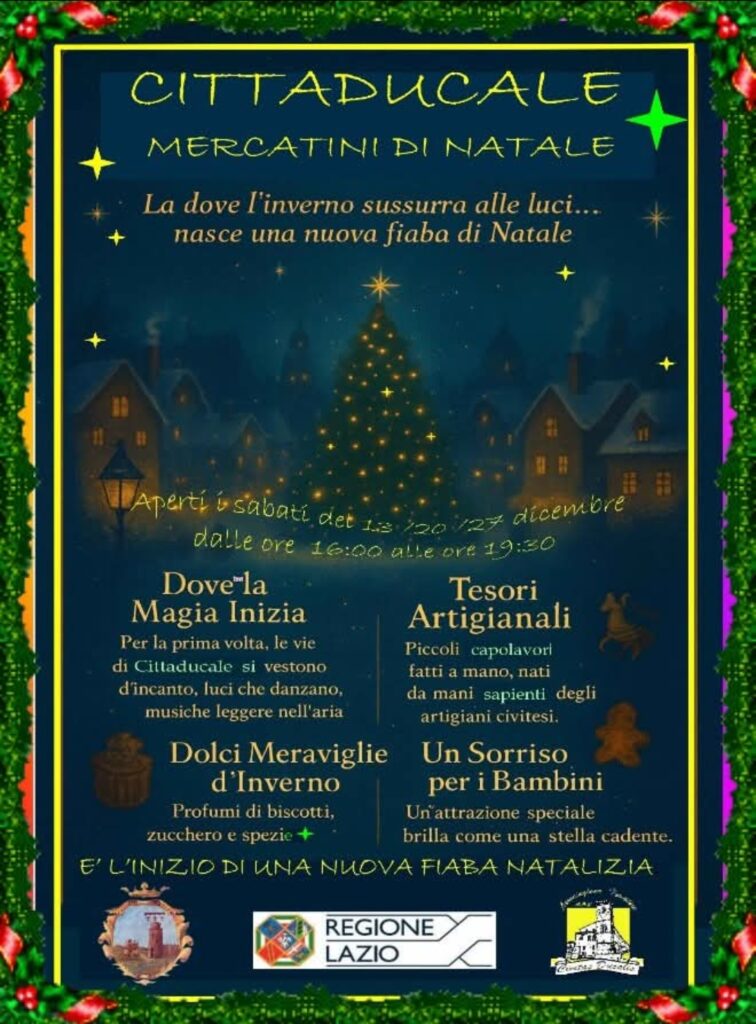 A Cittaducale nelle giornate di sabato 20 e 27 dicembre nella addobbata Piazza del Popolo, a Cittaducale, la prima edizione dei mercatini di Natale. L’Idea nasce da due conosciutissime commercianti locali, Barbara Tocca e Patrizia Ferraresi le quali, consapevoli che nel borgo civitese c’è tanta gente che si prodiga nella realizzazione di lavoretti artigianali, al fine di ravvivare il borgo angioino conferendo allo stesso la magica atmosfera del Natale.