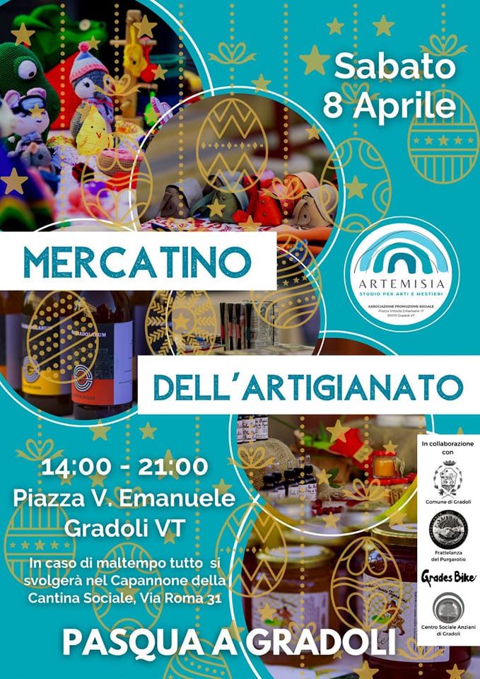 Sabato 8 aprile 2023, dalle ore 14.00 alle ore 21.00, si svolgerà a Gradoli il Mercatino dell’artigianato.