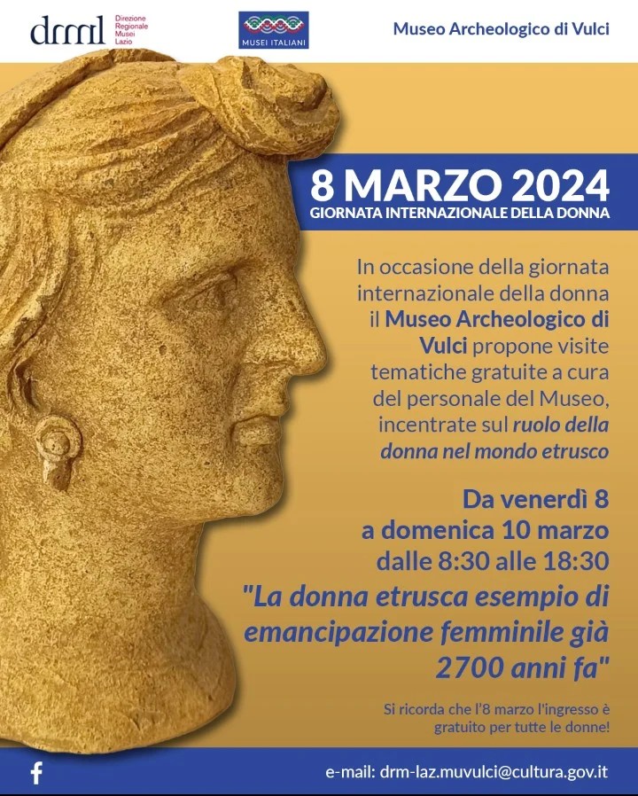 In occasione della Giornata internazionale della Donna, sarà allestita dall’8 al 10 marzo 2024 presso il Museo Nazionale Archeologico di Vulci, nel comune di Canino, una mostra dal titolo La donna etrusca esempio di emancipazione femminile già 2700 anni fa.
