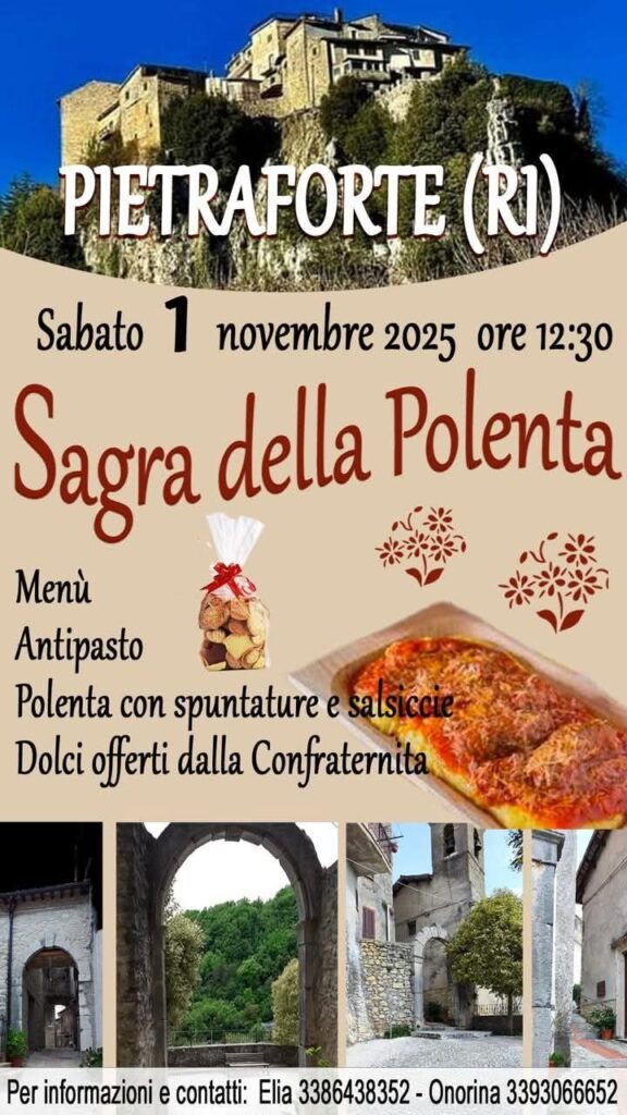 Sabato 1° novembre a Pietraforte, piccolo borgo del comune di Pozzaglia Sabina, si terrà la Sagra della Polenta che si potrà gustare con spuntature e salsicce da un antipasto e da dolci offerti dalla confraternita.