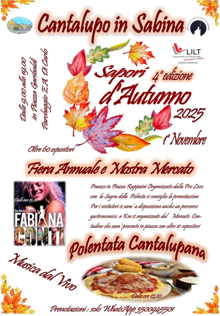 Cantalupo in Sabina ospiterà la 4^ edizione de I Sapori d’Autunno. Sabato 1°novembre si potranno gustare prodotti tipici oltre che la polenta cantalupana, il tutto accompagnato da buona musica. Sarà a disposizione dei visitatori anche un percorso gastronomico con prodotti locali, organizzato dal mercato contadino.