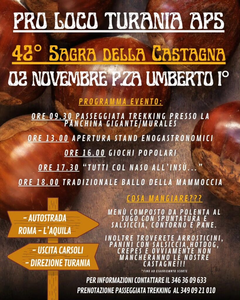 Domenica 2 novembre a Turania torna la Sagra della Castagna. La 42^ edizione celebrerà il frutto autunnale con un programma di eventi che includerà stand enogastronomici, giochi popolari e un programma di iniziative come un trekking per la mattina.