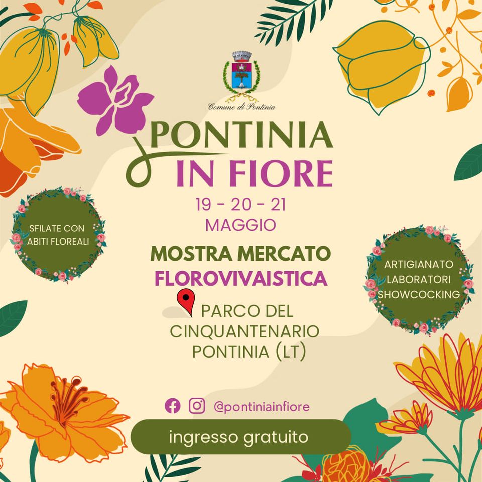 Dal 19 al 21 maggio dodicesima edizione di “Pontinia in Fiore dove ”professionisti, esperti e appassionati del settore potranno incontrarsi per acquistare piante, attrezzature, concimi, e molto altro ancora.