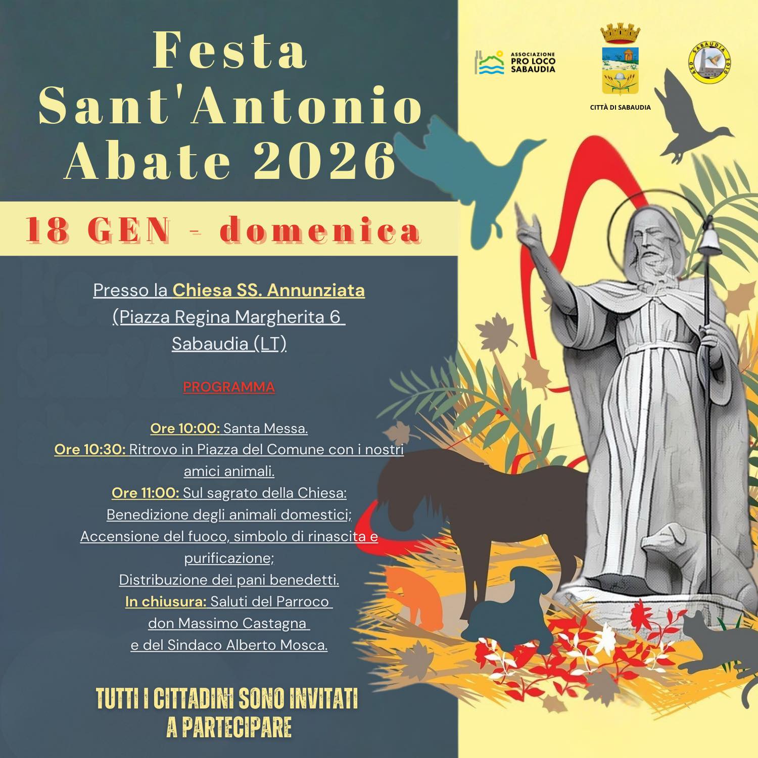 L’evento si svolgerà presso la Chiesa SS. Annunziata, inizierà alle ore 10:00 con la Santa Messa a seguire alle ore 10:30 è previsto il ritrovo in Piazza del Comune insieme ai nostri amici animali, protagonisti della festa dove sul sagrato della chiesa, si terranno la benedizione degli animali domestici, l’accensione del fuoco – simbolo di rinascita e purificazione – e la distribuzione dei pani benedetti.
