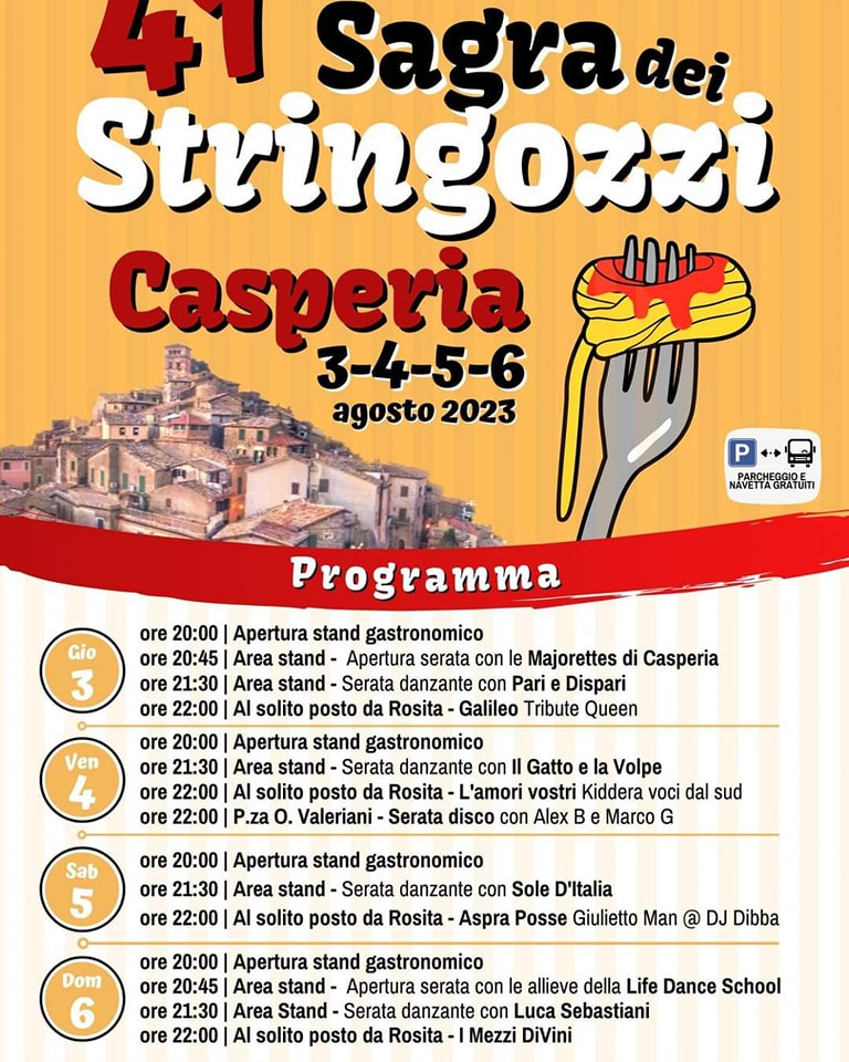 Nella splendida location di Casperia, borgo insignito della bandiera arancione del turismo, appuntamento da non perdere con la Sagra degli Stringozzi, storico evento del Lazio dedicato a questa particolare pasta lunga a sezione rettangolare. Dal 3 al 6 agosto nel borgo bandiera arancione Touring Club Italiano un ricco programma di eventi e tante prelibatezze enogastronomiche.