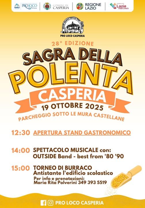 Al via a Casperia domenica 19 ottobre 2025 la XXVIII Sagra della Polenta. Il piatto tipico della cucina povera invernale è il protagonista di una giornata di festa, ricca di musica, storia e tanto divertimento.