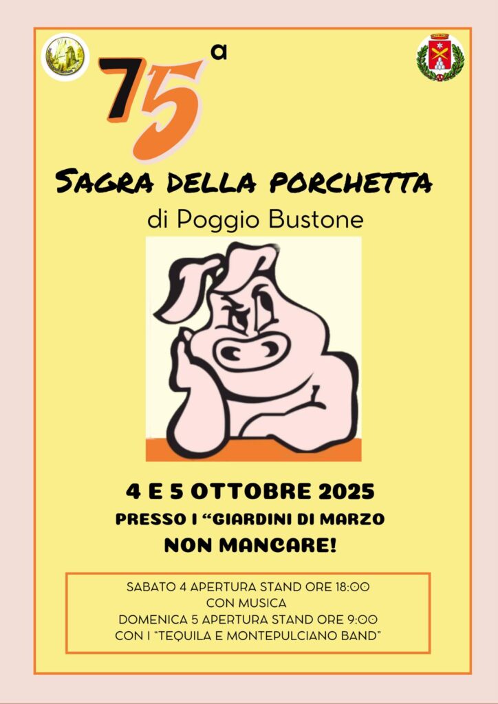 Sabato 4 e domenica 5 ottobre saranno due giorni durante i quali visitatori e appassionati di gastronomia potranno deliziarsi con stand gastronomici con una vasta gamma di prodotti tipici, tutti rigorosamente legati alla tradizione culinaria locale. La sagra non sarà solo un’occasione per assaporare la prelibata porchetta, ma anche un momento di convivialità e scoperta delle altre specialità locali, come salumi, formaggi e dolci tipici, durante i quali non mancheranno le iniziative e la musica.