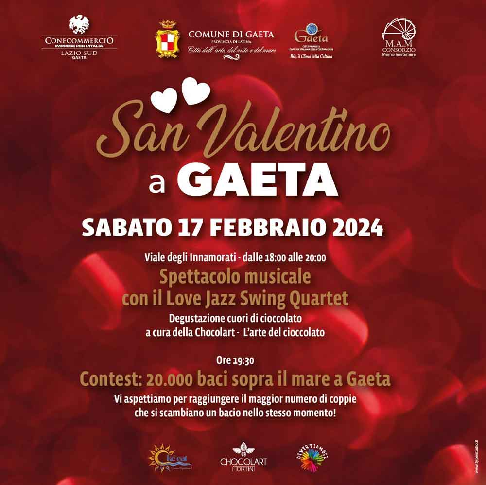 Mercoledì 14 febbraio 2024, sono in programma pizza e tanti giochi per tutti i bambini nella sede dell’Associazione Ricreativa “Divertiamoci” in Via Indipendenza, 206. Sabato 17 febbraio dalle 19:30 alle 22:30 sono in programma la degustazione cuori di cioccolato a cura di Chocolart – L’arte del Cioccolato, e lo spettacolo musicale del Love Jazz Swing Quartet, a cura di Ké Eat Gaeta.