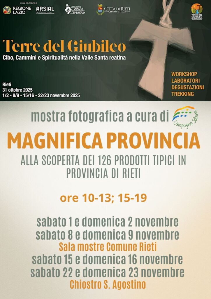 A Rieti e nella Valle Santa Reatina si svolge l’evento “Terre del Giubileo: Cibo, Cammini e Spiritualità“, un’iniziativa che mira a valorizzare il patrimonio religioso e gastronomico del territorio in vista del Giubileo 2025.