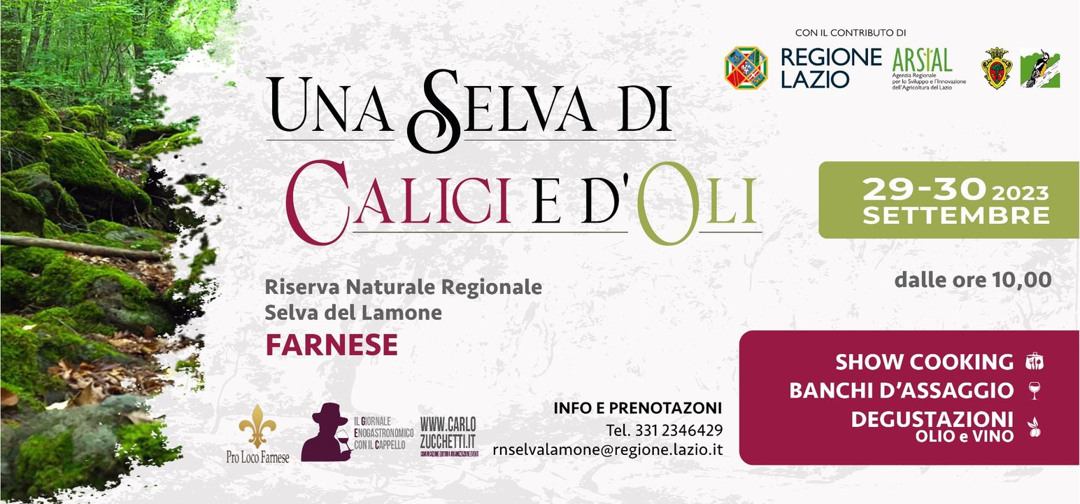 Dal 29 al 30 settembre 2023, la Riserva Naturale Regionale Selva del Lamone di Farnese vi attende per Una Selva di Calici e d’Oli, due giorni all’insegna del buon gusto e della natura.