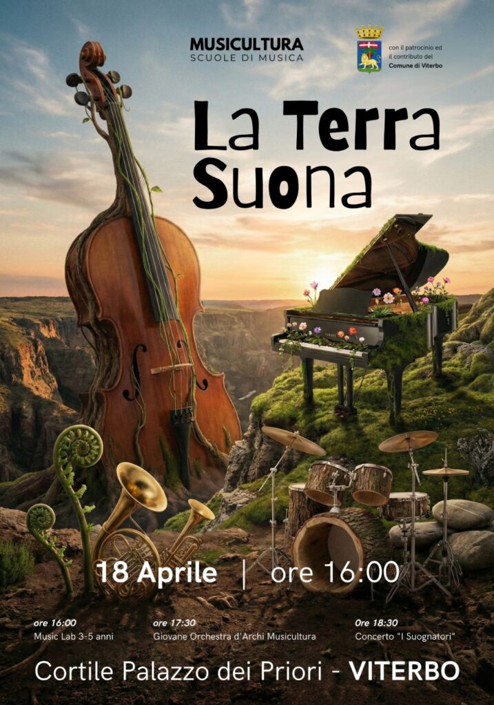 Sabato 18 aprile 2026 dalle ore 16.00 alle 19.30, al Cortile di Palazzo dei Priori a Viterbo, si svolgerà l’evento musicale “La Terra Suona”.