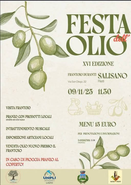 Anche quest’anno domenica 9 novembre torna a Salisano la Festa dell’Olio, giunta alla sua sedicesima edizione. La manifestazione, che ha lo scopo di valorizzare uno dei prodotti più importanti della Sabina, prevede il pranzo con i prodotti locali, conditi con l’olio nuovo, l’esposizione di artigiani locali e tanta buona musica.