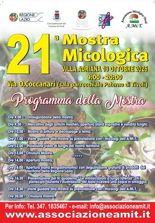 Il 19 ottobre 2025 si svolge a Tivoli, presso la sala parrocchiale di Paterno (Via O. Coccanari – Villa Adriana) la XXI Mostra Micologica, una giornata di conoscenza e divulgazione sulla biodiversità fungina del territorio.