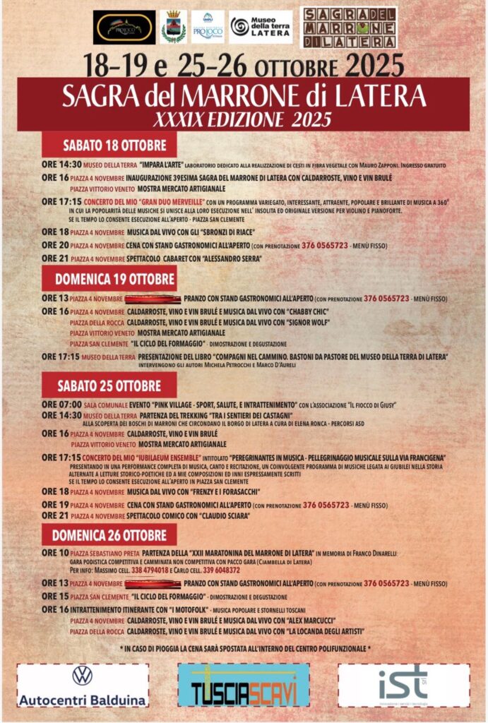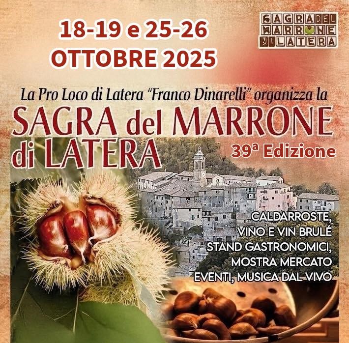 L’autunno è la stagione dei ciclamini, dei funghi, ma soprattutto delle castagne e nel borgo medievale di Latera, nei due fine settimana del 18 e del 25 ottobre 2025, ci si prepara a festeggiare la XXXIX edizione della Sagra del Marrone.